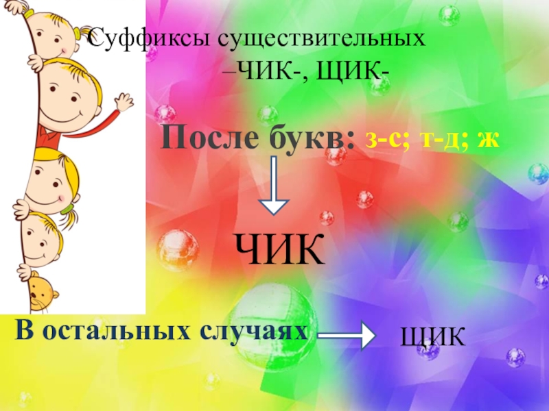 Суффиксы существительных –ЧИК-, ЩИК-После букв: з-с; т-д; ж ЧИКВ остальных случаяхЩИК
