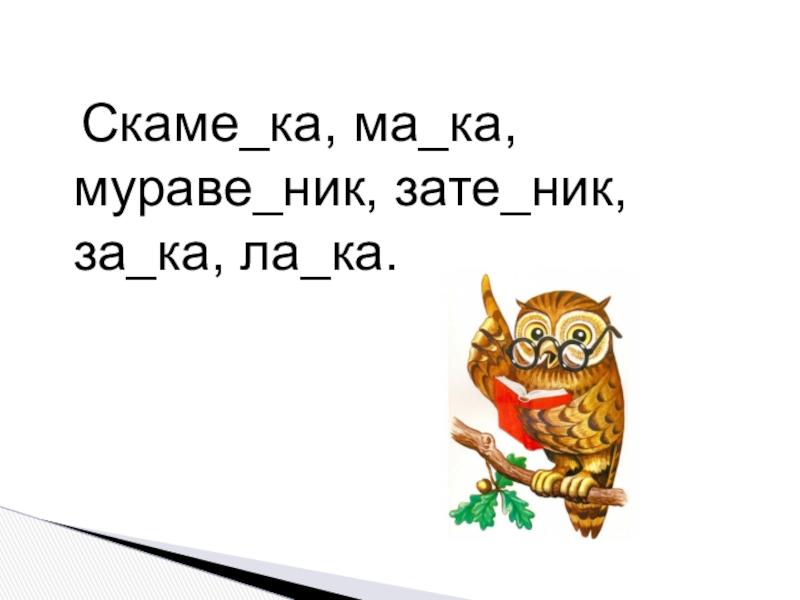 Слайд 7 Скаме_ка, ма_ка, мураве_ник, зате_ник, за_ка, ла_ка.