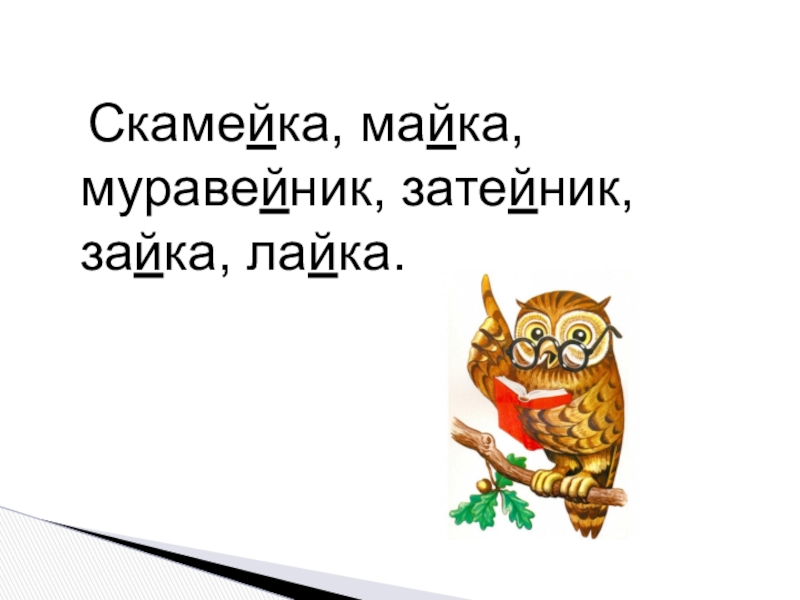 Слайд 8 Скамейка, майка, муравейник, затейник, зайка, лайка.