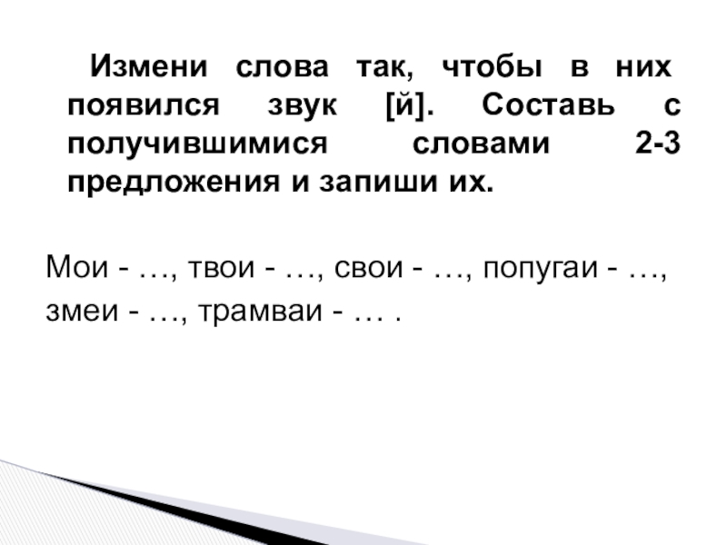 Слайд 5 Измени слова так, чтобы в них появился звук [й]. Составь