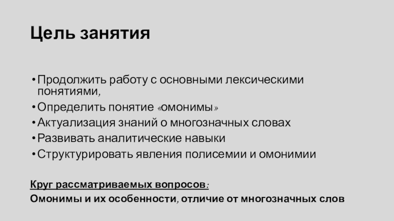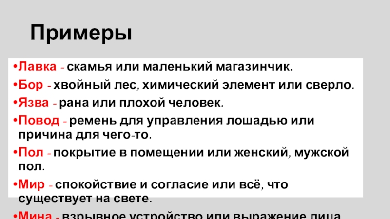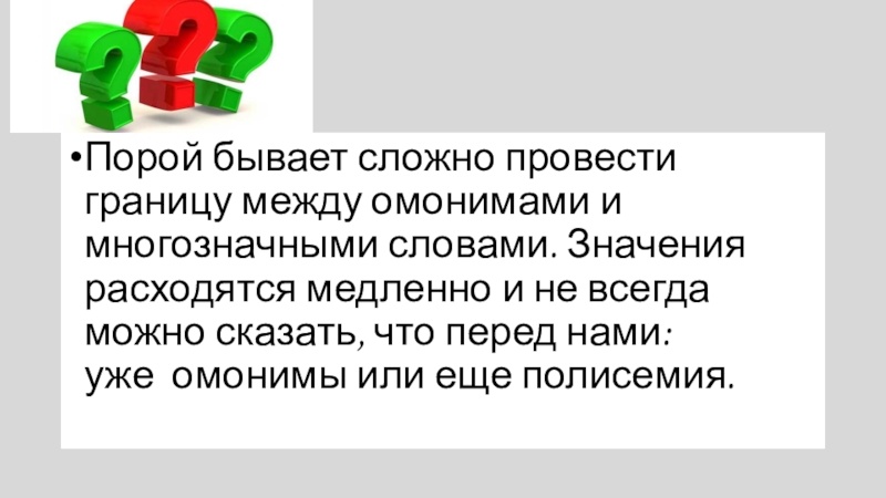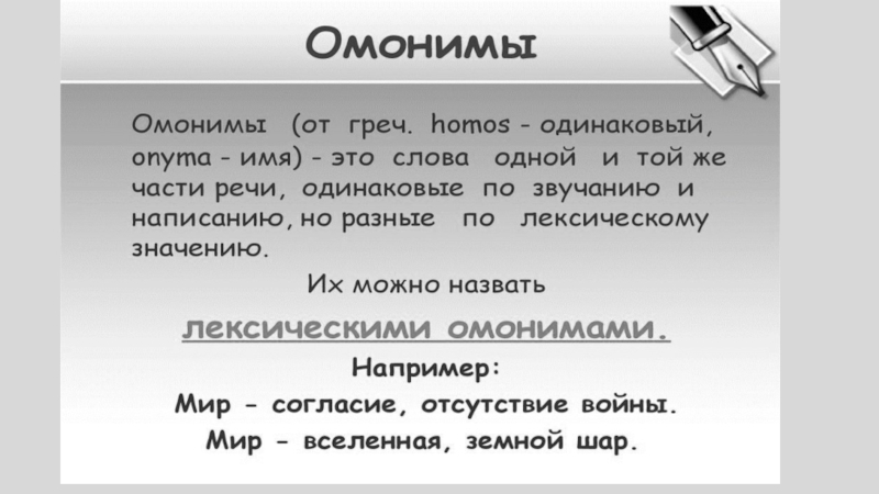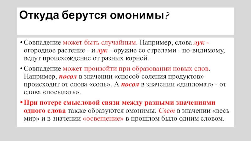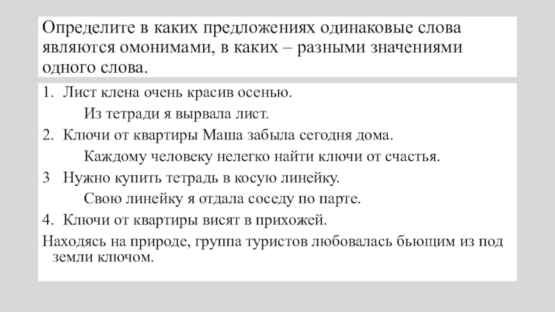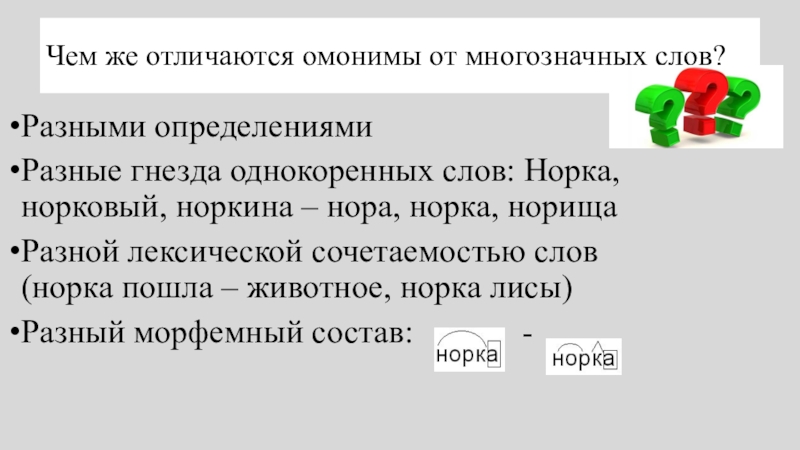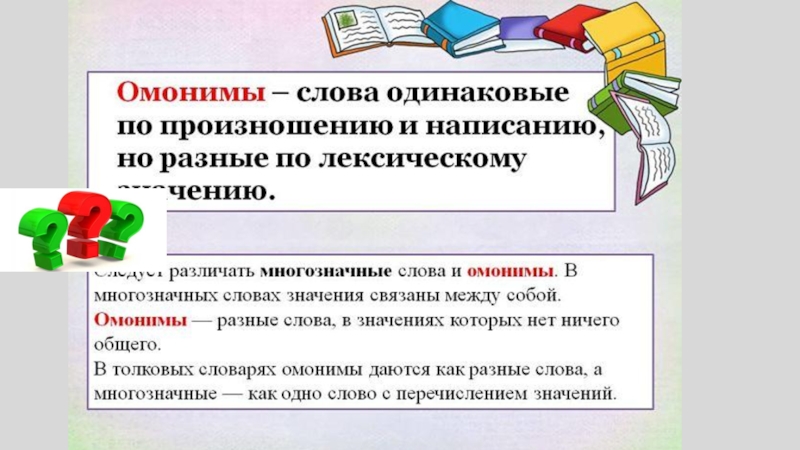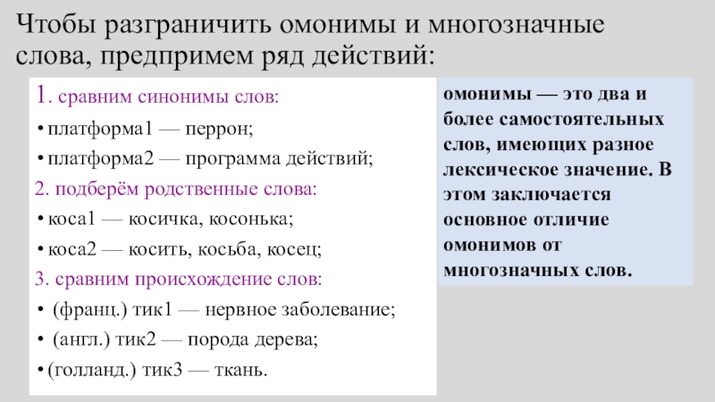 омонимы — это два и более самостоятельных слов, имеющих разное лексическое значение. В этом заключается основное отличие омонимов от многозначных слов.
