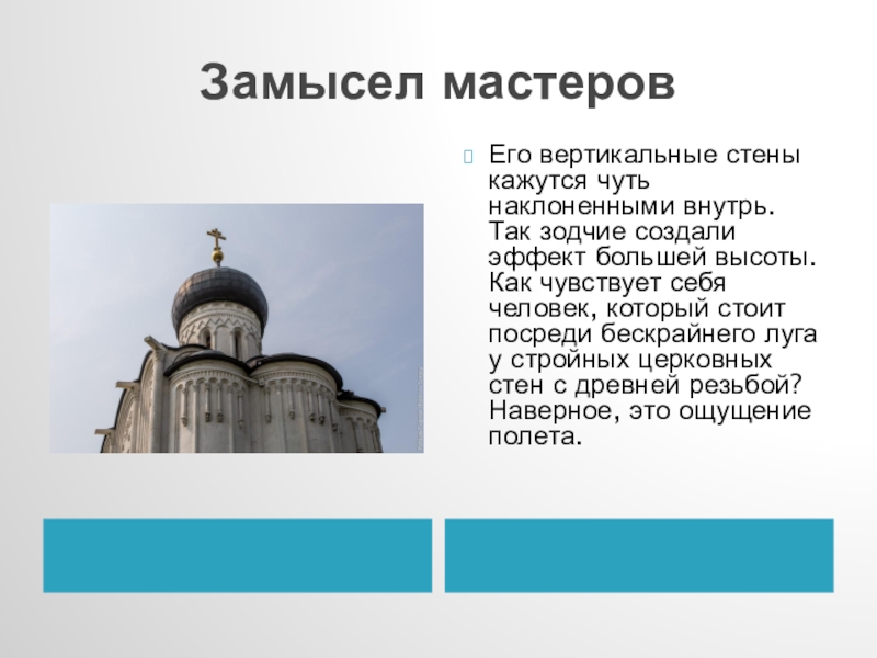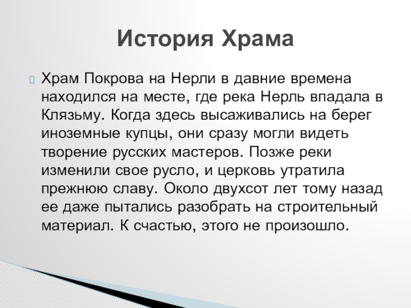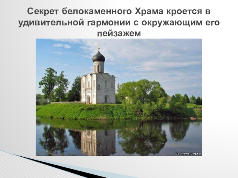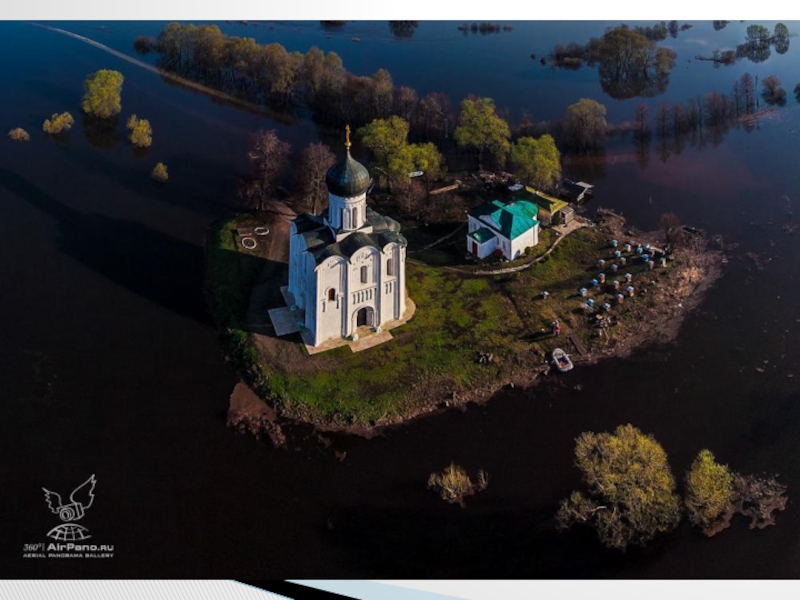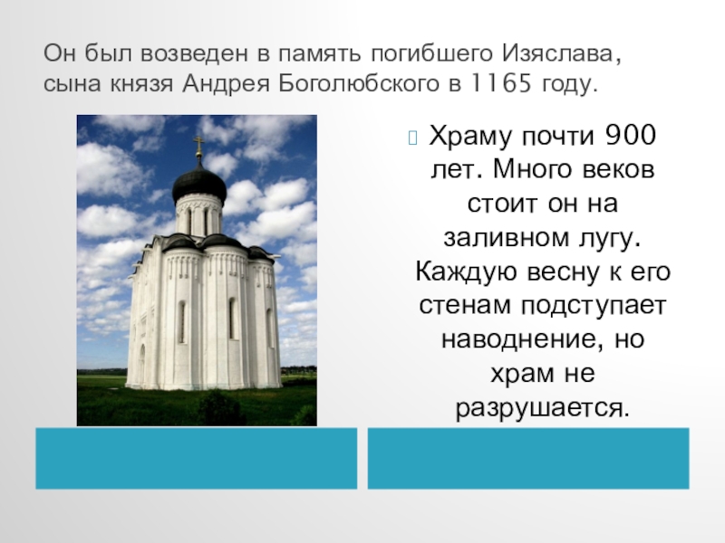 Храму почти 900 лет. Много веков стоит он на заливном лугу. Каждую весну к его стенам подступает наводнение, но храм не разрушается.