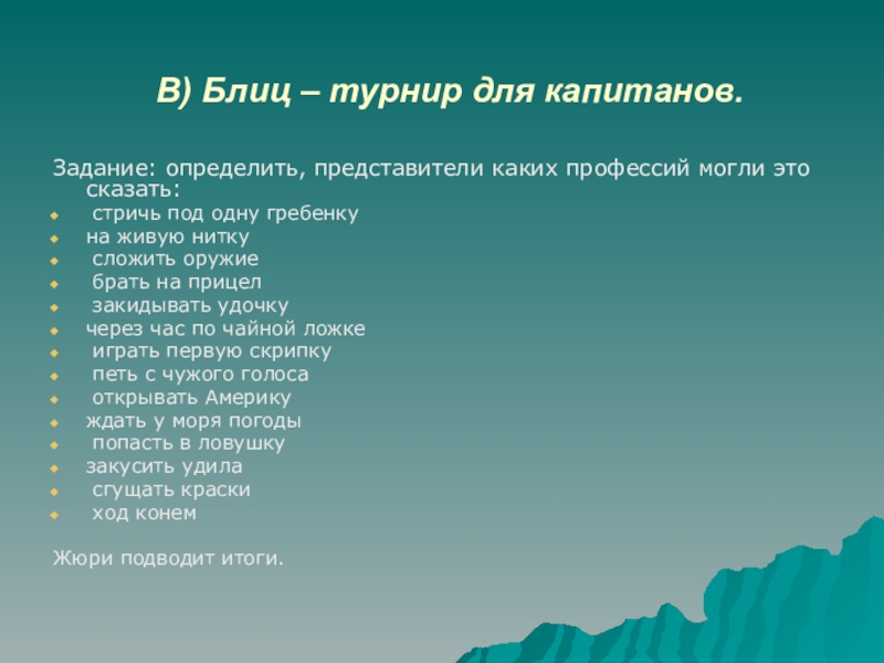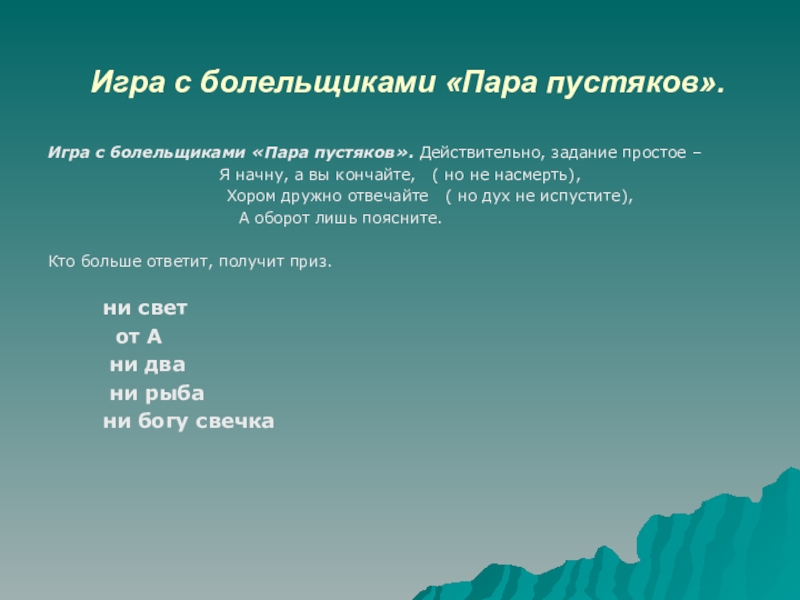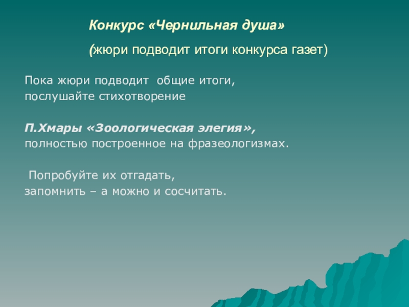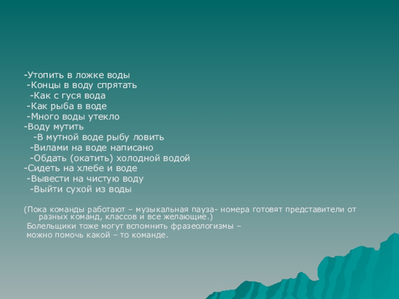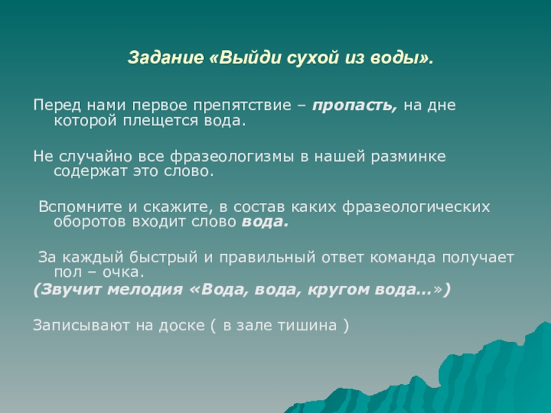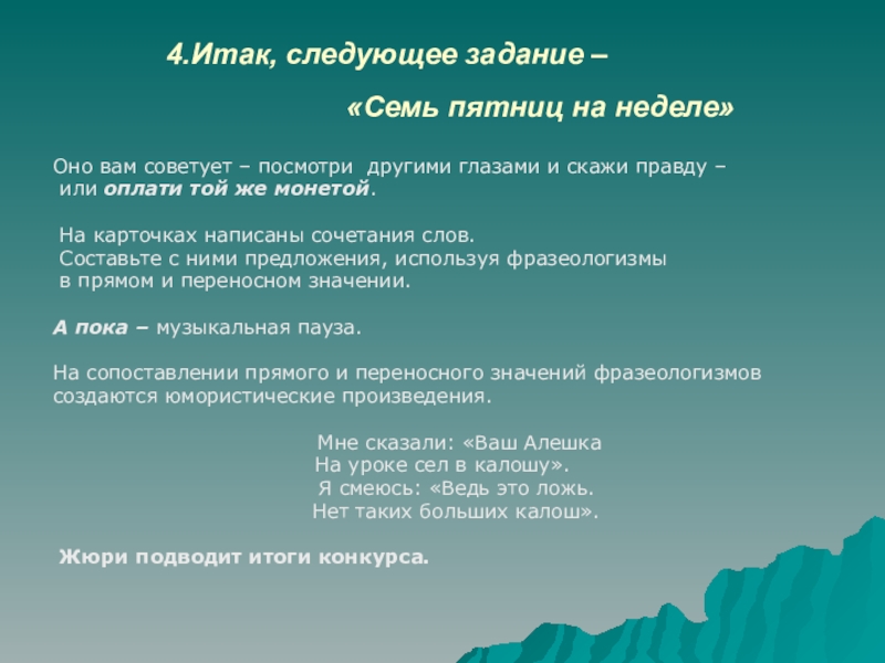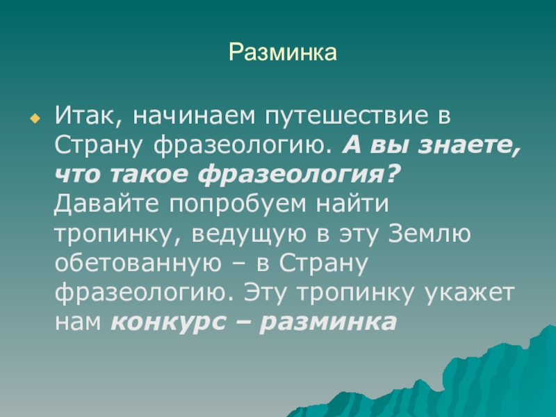 фразеология? Давайте попробуем найти тропинку, ведущую в эту Землю обетованную – в Страну фразеологию. Эту тропинку укажет нам конкурс – разминка