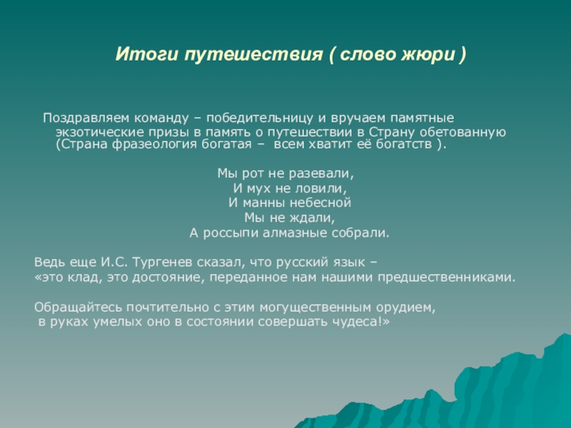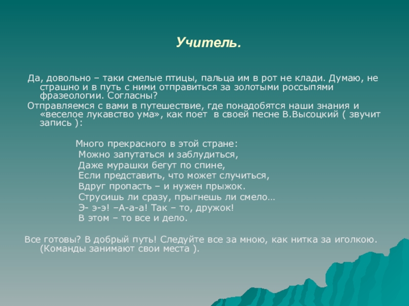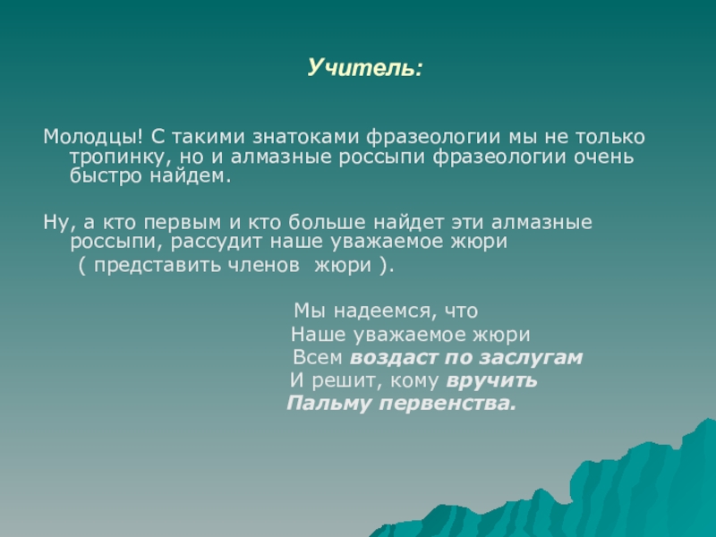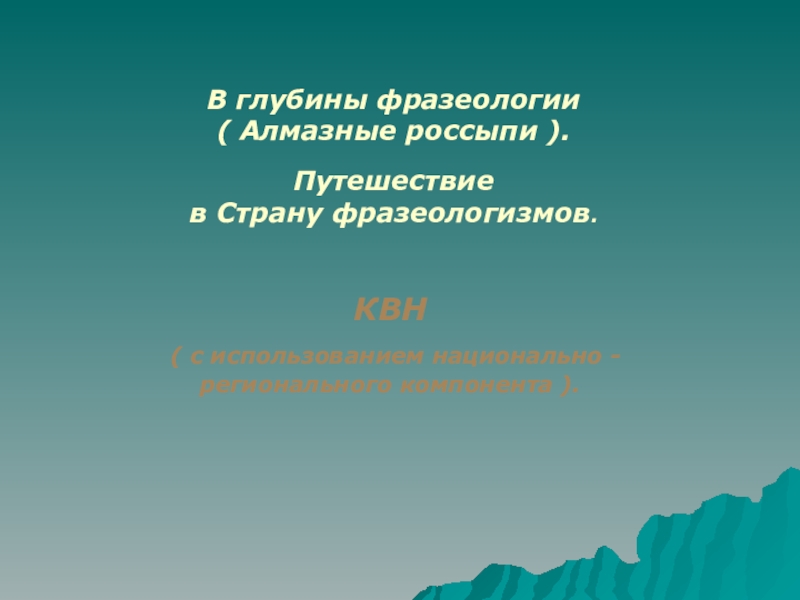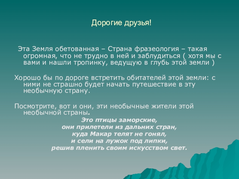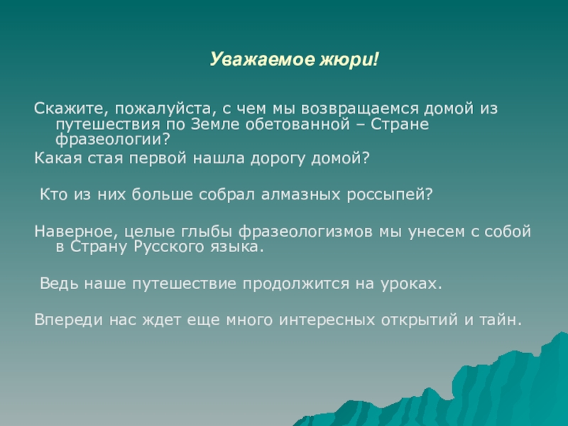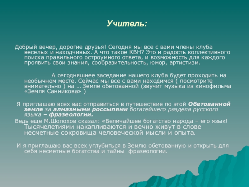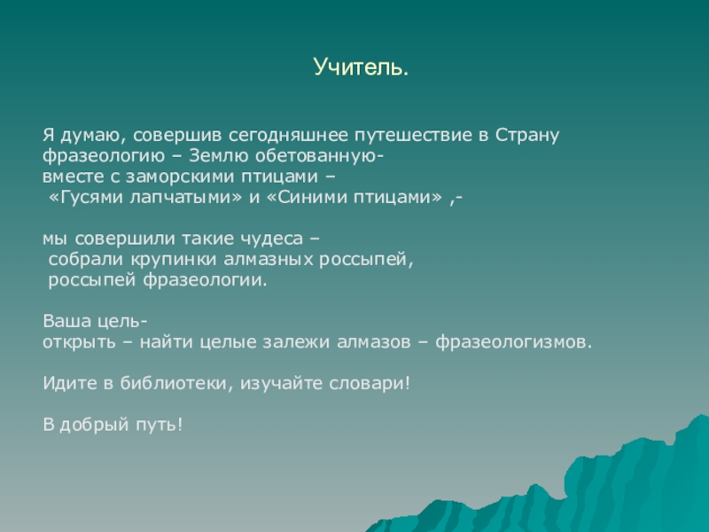 Я приглашаю всех вас отправиться в путешествие по этой Обетованной земле за алмазными россыпями богатейшего раздела русского языка – фразеологии.