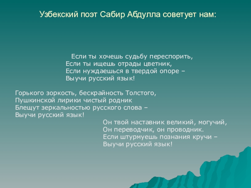 Слайд 36Узбекский поэт Сабир Абдулла советует нам: