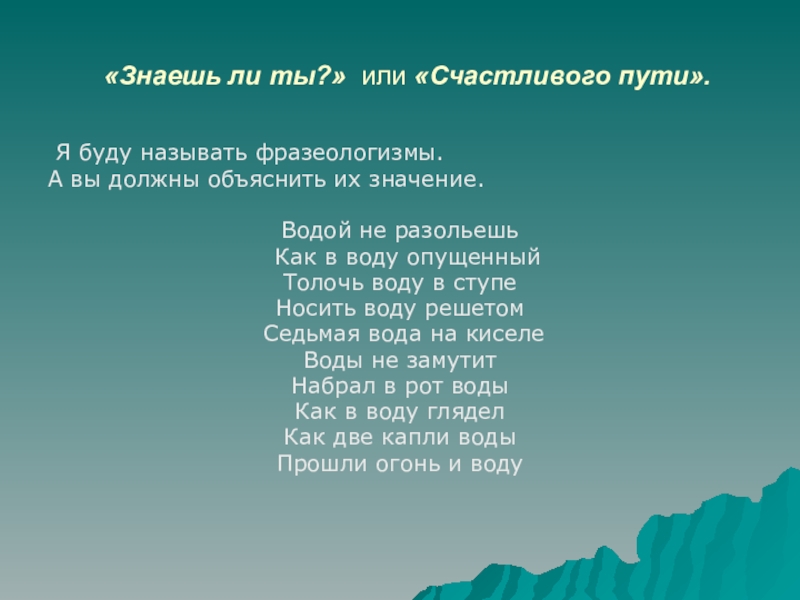 Итак, начинаем путешествие в Страну фразеологию. А вы знаете, что такое