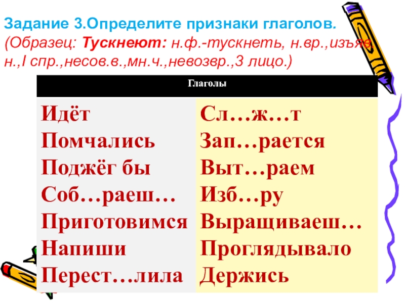 Слайд 7Задание 3.Определите признаки глаголов. (Образец: Тускнеют: н.ф.-тускнеть, н.вр.,изъяв.н.,I спр.,несов.в.,мн.ч.,невозвр.,3 лицо.)