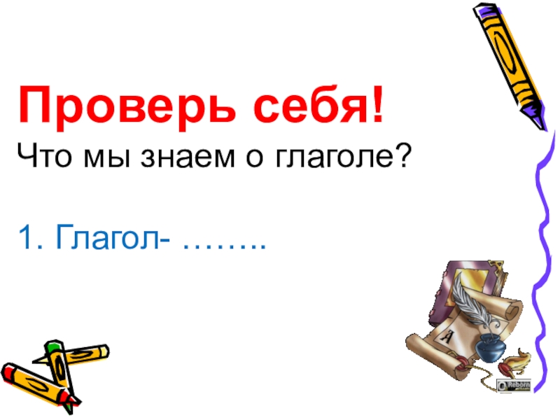 Слайд 3 Проверь себя! Что мы знаем о глаголе? 1. Глагол- ……..