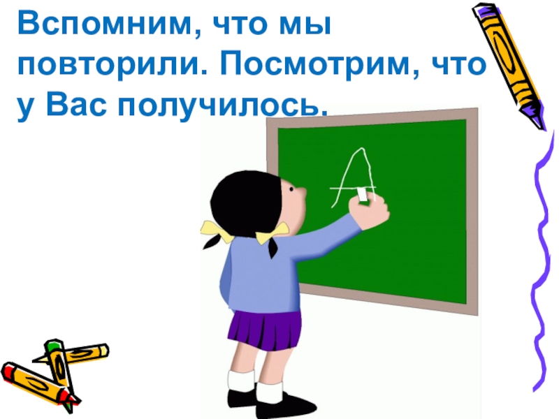 Слайд 12Вспомним, что мы повторили. Посмотрим, что у Вас получилось.
