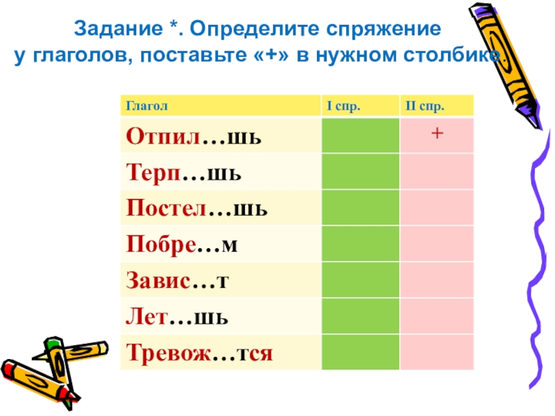 Слайд 10Задание *. Определите спряжение у глаголов, поставьте «+» в нужном столбике.