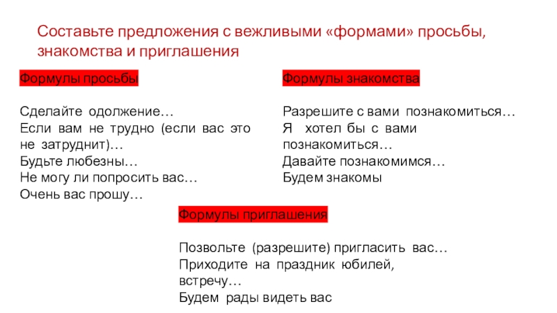 Составьте предложения с вежливыми «формами» просьбы, знакомства и приглашения