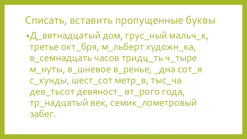 Списать, вставить пропущенные буквыД_вятнадцатый дом, грус_ный мальч_к, третье окт_бря, м_льберт художн_ка, в_семнадцать часов тридц_ть ч_тыре м_нуты, в_шневое в_ренье, _дна сот_я с_кунды, шест_сот метр_в, тыс_ча дев_тьсот девяност_ вт_рого года, тр_надцатый век, семик_лометровый забег.