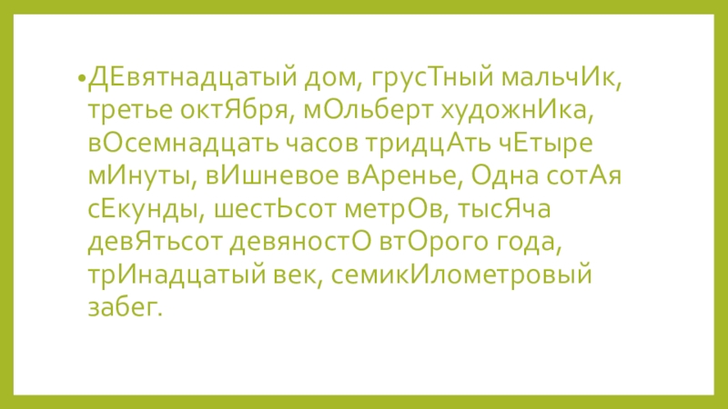 Слайд 3ДЕвятнадцатый дом, грусТный мальчИк, третье октЯбря, мОльберт художнИка, вОсемнадцать часов тридцАть