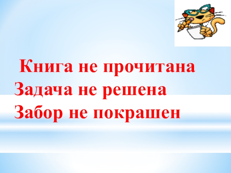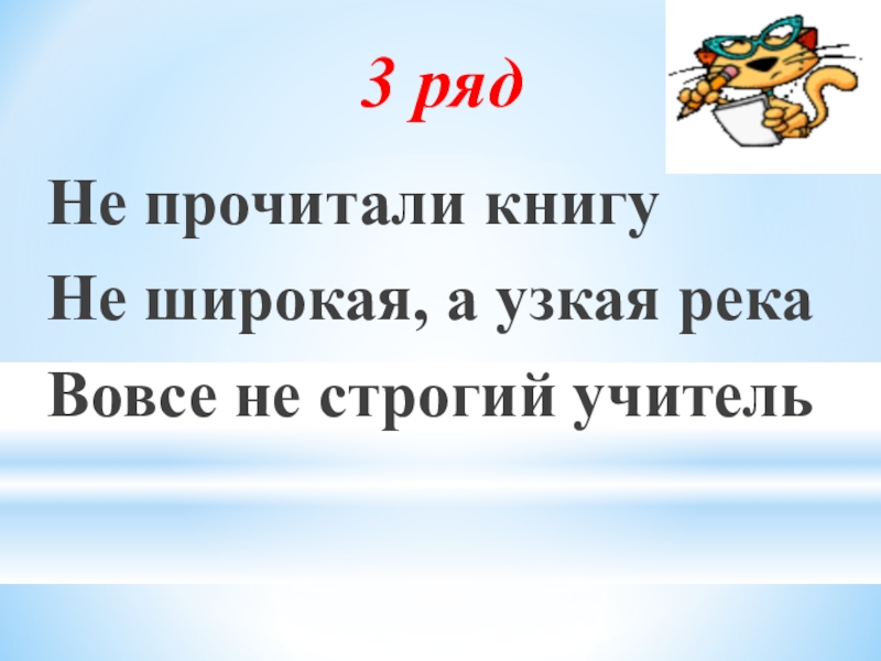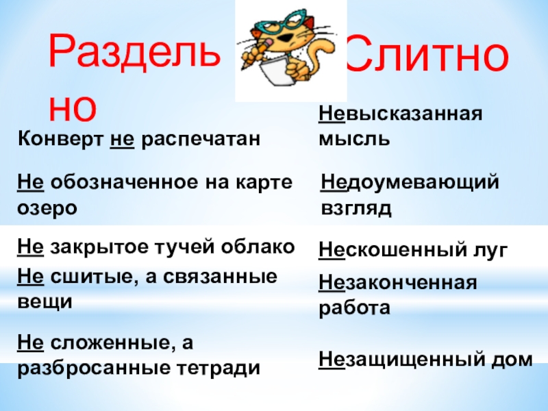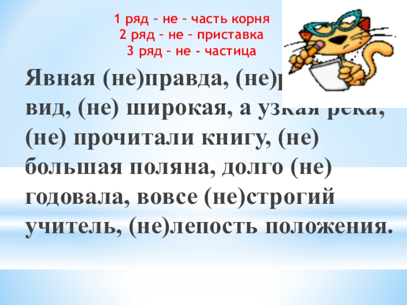 Явная (не)правда, (не)ряшливый вид, (не) широкая, а узкая река; (не) прочитали книгу, (не)большая поляна, долго (не)годовала, вовсе (не)строгий учитель, (не)лепость положения.