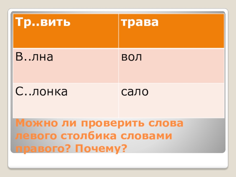 Слайд 2Можно ли проверить слова левого столбика словами правого? Почему?