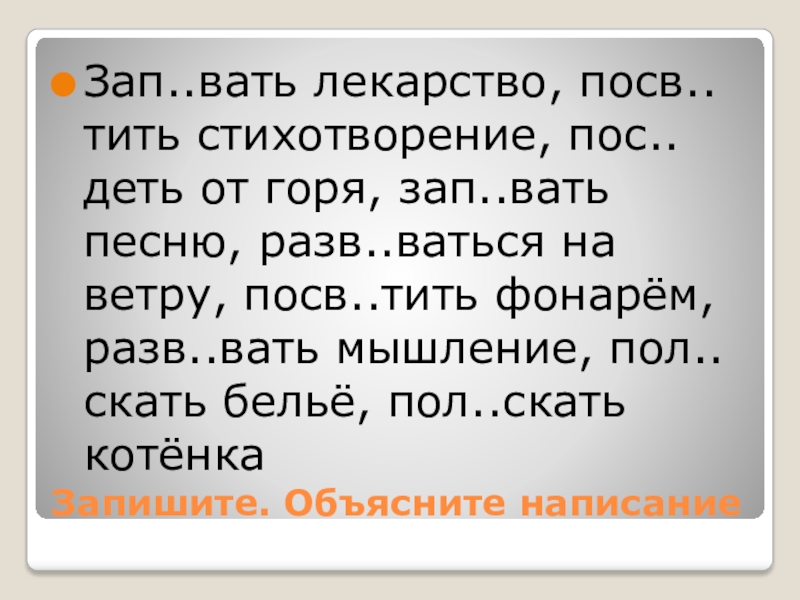 Запишите. Объясните написаниеЗап..вать лекарство, посв..тить стихотворение, пос..деть от горя, зап..вать песню, разв..ваться на ветру, посв..тить фонарём, разв..вать