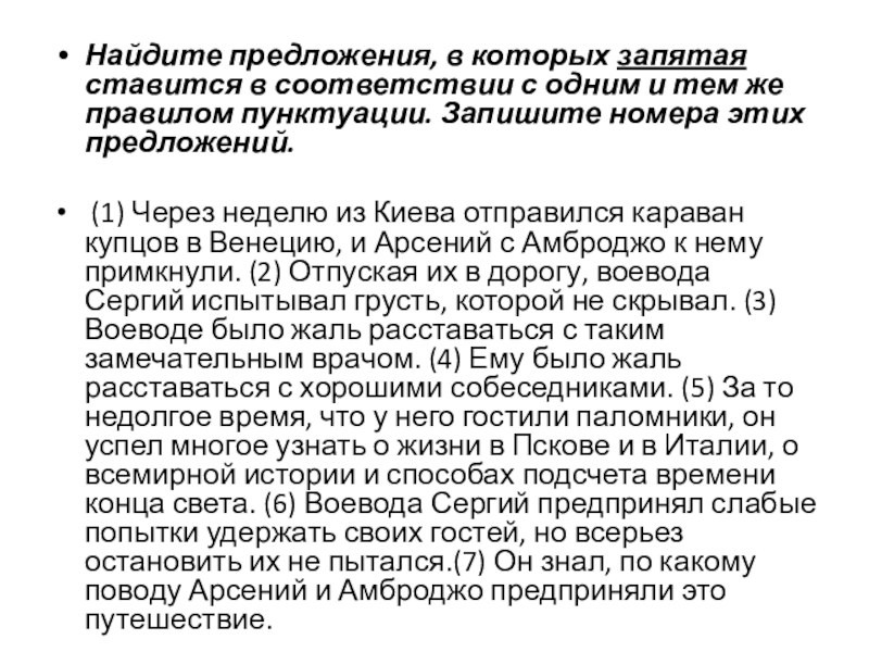 (1) Через неделю из Киева отправился караван купцов в Венецию, и Арсений с Амброджо к нему примкнули. (2) Отпуская их в дорогу, воевода Сергий испытывал грусть, которой не скрывал. (3) Воеводе было жаль расставаться с таким замечательным врачом. (4) Ему было жаль расставаться с хорошими собеседниками. (5) За то недолгое время, что у него гостили паломники, он успел многое узнать о жизни в Пскове и в Италии, о всемирной истории и способах подсчета времени конца света. (6) Воевода Сергий предпринял слабые попытки удержать своих гостей, но всерьез остановить их не пытался.(7) Он знал, по какому поводу Арсений и Амброджо предприняли это путешествие.