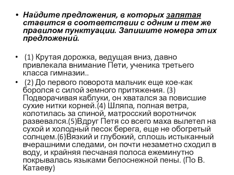 (2) До первого поворота мальчик еще кое-как боролся с силой земного притяжения. (3) Подворачивая каблуки, он хватался за повисшие сухие нитки корней.(4) Шляпа, полная ветра, колотилась за спиной, матросский воротничок развевался.(5)Вдруг Петя со всего маха вылетел на сухой и холодный песок берега, еще не обогретый солнцем.(6)Вязкий и глубокий, сплошь истыканный вчерашними следами, он почти незаметно сходил в воду, и крайняя песчаная полоса ежеминутно покрывалась языками белоснежной пены. (По В. Катаеву)