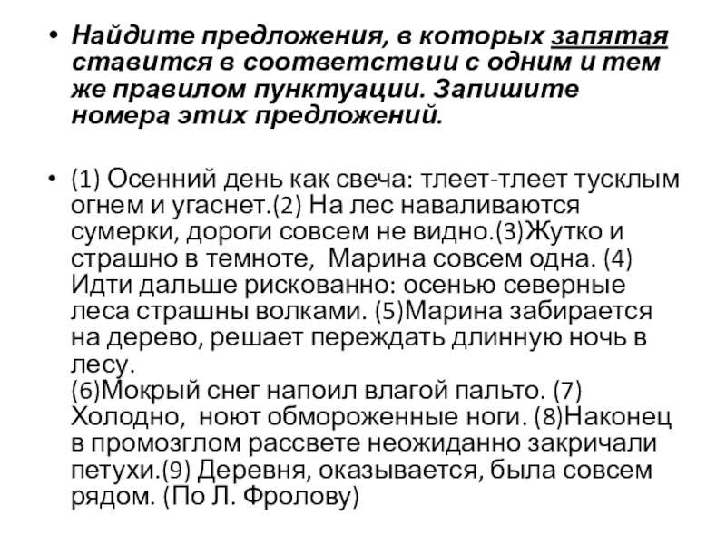 (1) Осенний день как свеча: тлеет-тлеет тусклым огнем и угаснет.(2) На лес наваливаются сумерки, дороги совсем не видно.(3)Жутко и страшно в темноте, Марина совсем одна. (4)Идти дальше рискованно: осенью северные леса страшны волками. (5)Марина забирается на дерево, решает переждать длинную ночь в лесу.