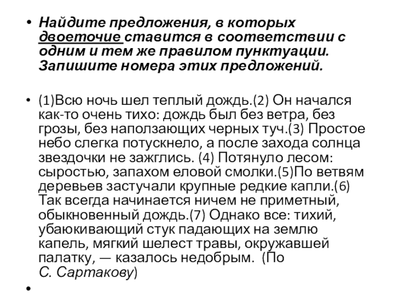 (1)Всю ночь шел теплый дождь.(2) Он начался как-то очень тихо: дождь был без ветра, без грозы, без наползающих черных туч.(3) Простое небо слегка потускнело, а после захода солнца звездочки не зажглись. (4) Потянуло лесом: сыростью, запахом еловой смолки.(5)По ветвям деревьев застучали крупные редкие капли.(6) Так всегда начинается ничем не приметный, обыкновенный дождь.(7) Однако все: тихий, убаюкивающий стук падающих на землю капель, мягкий шелест травы, окружавшей палатку, — казалось недобрым. (По С. Сартакову)