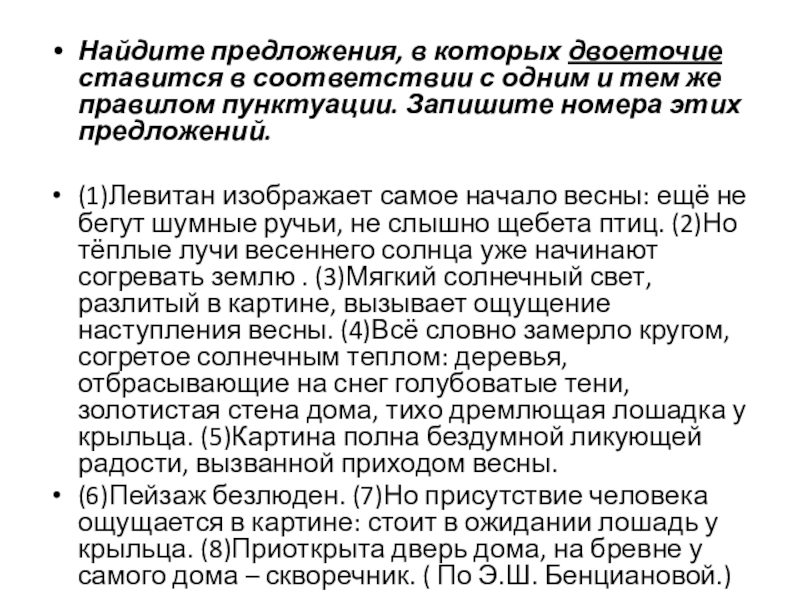(6)Пейзаж безлюден. (7)Но присутствие человека ощущается в картине: стоит в ожидании лошадь у крыльца. (8)Приоткрыта дверь дома, на бревне у самого дома – скворечник. ( По Э.Ш. Бенциановой.)