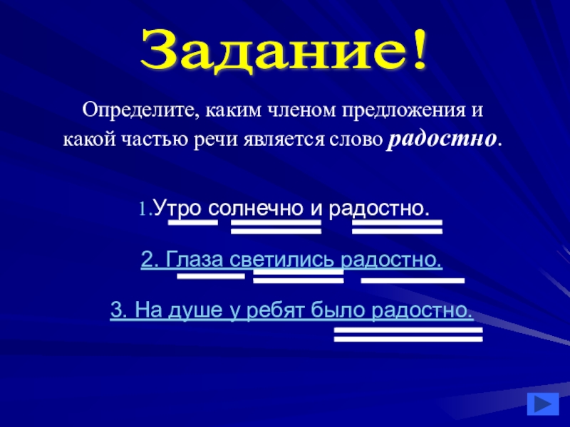 Определите, каким членом предложения и какой частью речи является слово радостно.