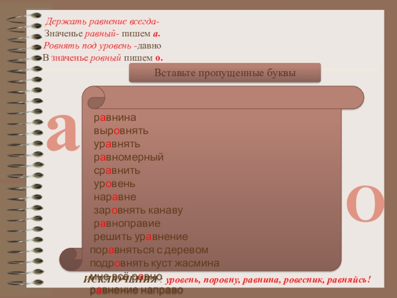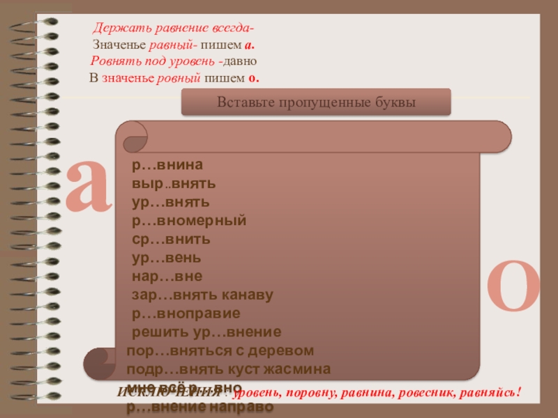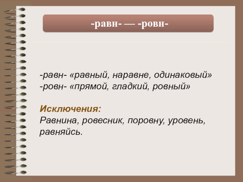 ИСКЛЮЧЕНИЯ : уровень, поровну, равнина, ровесник, равняйсь!