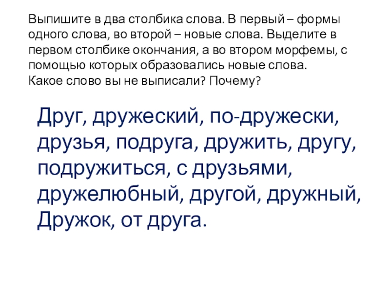 Друг, дружеский, по-дружески, друзья, подруга, дружить, другу, подружиться, с друзьями, дружелюбный, другой, дружный, Дружок, от друга.
