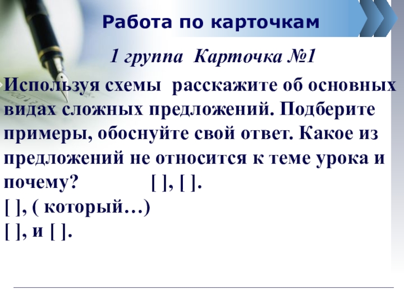 Используя схемы расскажите об основных видах сложных предложений. Подберите примеры, обоснуйте свой ответ. Какое из предложений не относится к теме урока и почему? [ ], [ ]. [ ], ( который…) [ ], и [ ].