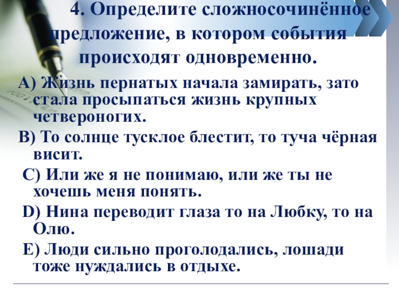 4. Определите сложносочинённое предложение, в котором события происходят одновременно.
