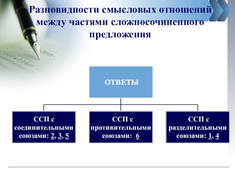 Слайд 16Разновидности смысловых отношений между частями сложносочиненного предложения