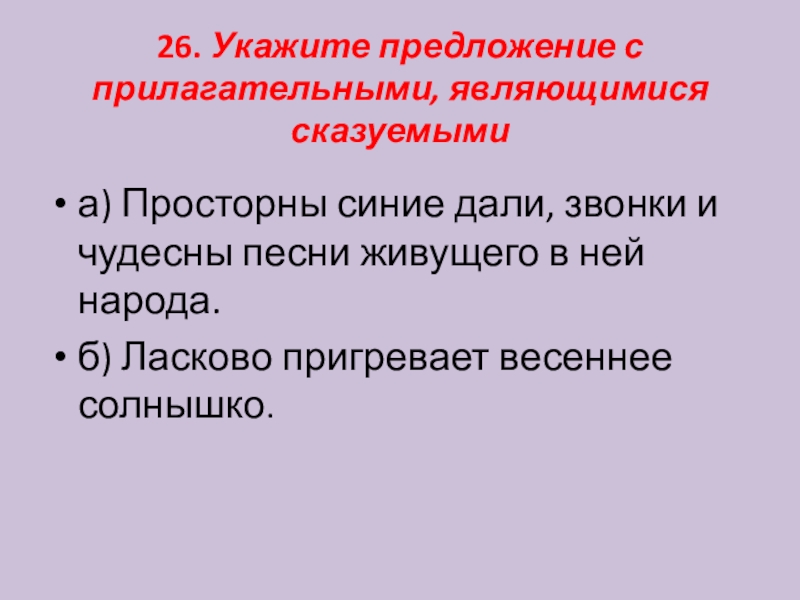 Слайд 2726. Укажите предложение с прилагательными, являющимися сказуемыми
