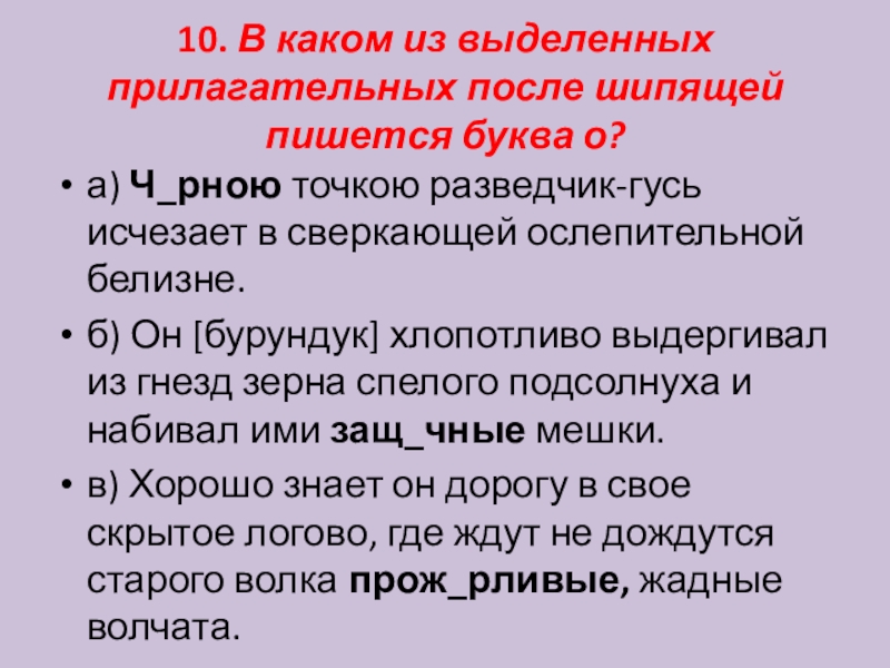 Слайд 1110. В каком из выделенных прилагательных после шипящей пишется буква о?