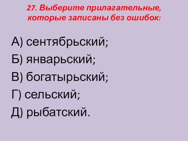 Слайд 2827. Выберите прилагательные, которые записаны без ошибок: