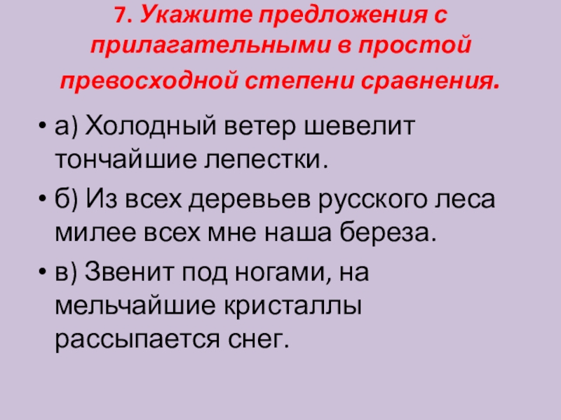 Слайд 87. Укажите предложения с прилагательными в простой превосходной степени сравнения.