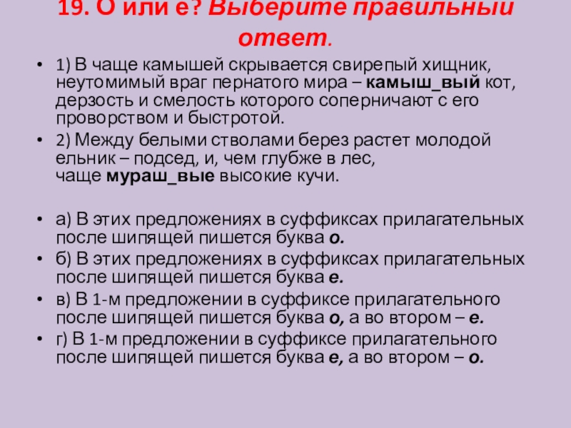Слайд 2019. О или е? Выберите правильный ответ.