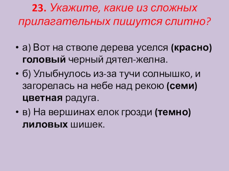 Слайд 2423. Укажите, какие из сложных прилагательных пишутся слитно?