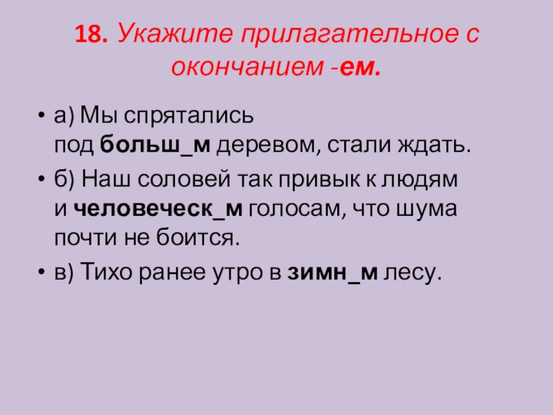 Слайд 1918. Укажите прилагательное с окончанием -ем.