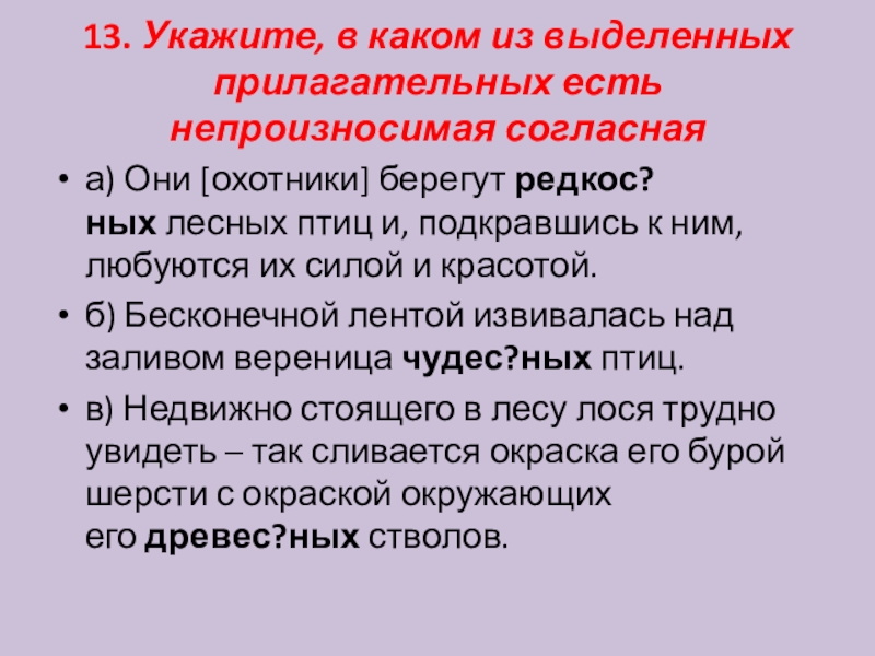 Слайд 1413. Укажите, в каком из выделенных прилагательных есть непроизносимая согласная