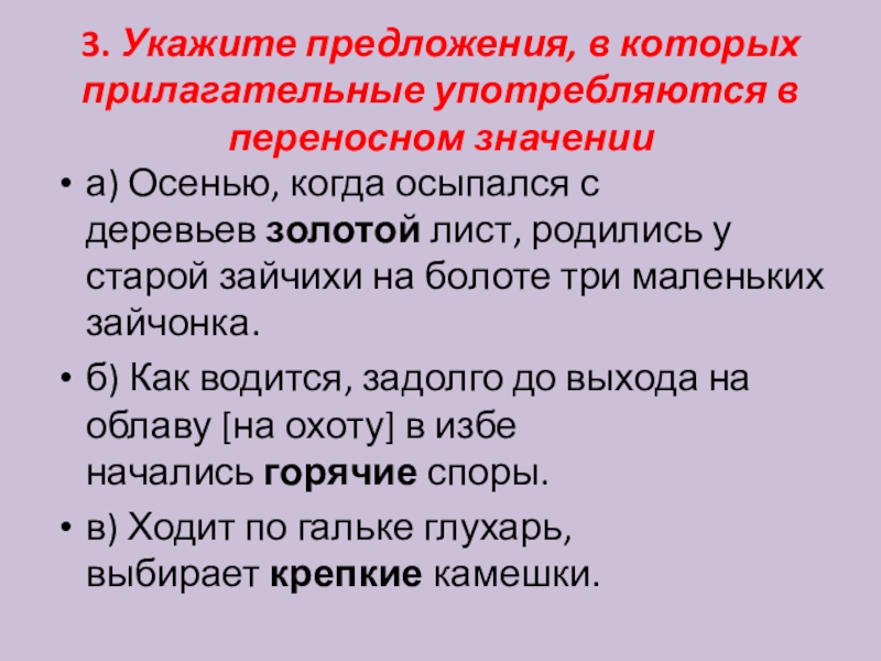 Слайд 43. Укажите предложения, в которых прилагательные употребляются в переносном значении