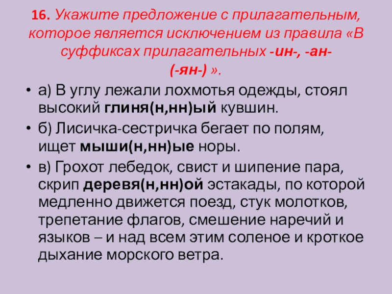 Слайд 1716. Укажите предложение с прилагательным, которое является исключением из правила «В суффиксах