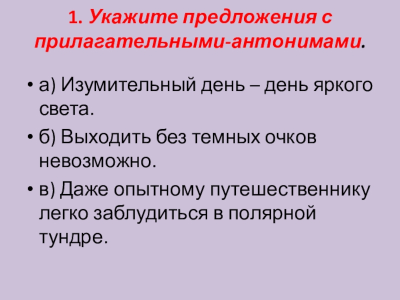 Слайд 21. Укажите предложения с прилагательными-антонимами.