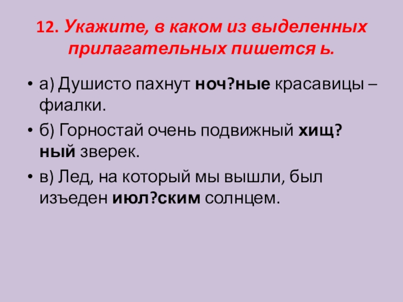 Слайд 1312. Укажите, в каком из выделенных прилагательных пишется ь.