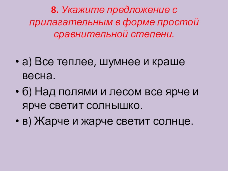 Слайд 98. Укажите предложение с прилагательным в форме простой сравнительной степени.