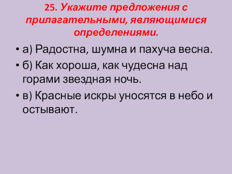 Слайд 2625. Укажите предложения с прилагательными, являющимися определениями.