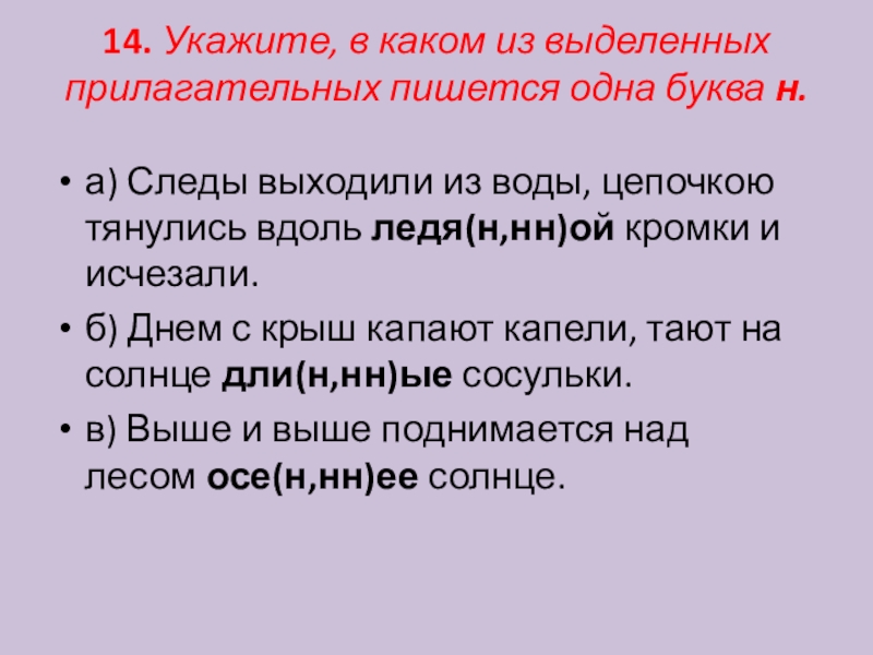 Слайд 1514. Укажите, в каком из выделенных прилагательных пишется одна буква н.