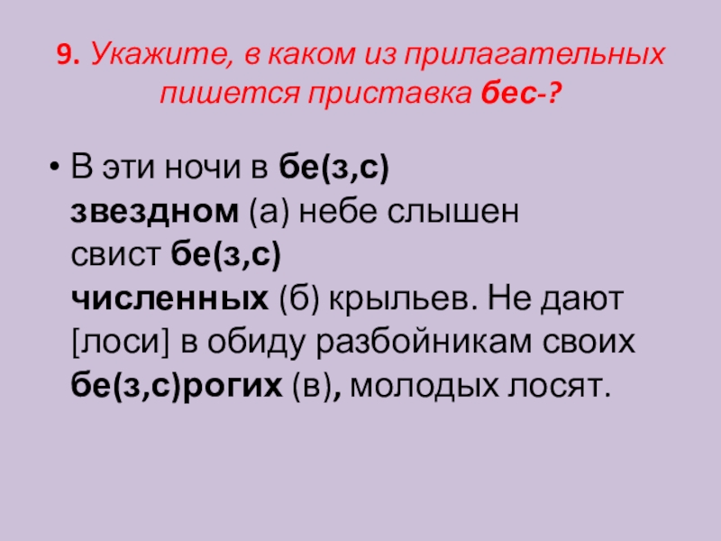 свист бе(з,с)численных (б) крыльев. Не дают [лоси] в обиду разбойникам своих бе(з,с)рогих (в), молодых лосят.