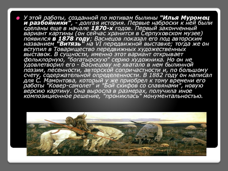 Слайд 10У этой работы, созданной по мотивам былины "Илья Муромец и разбойники",