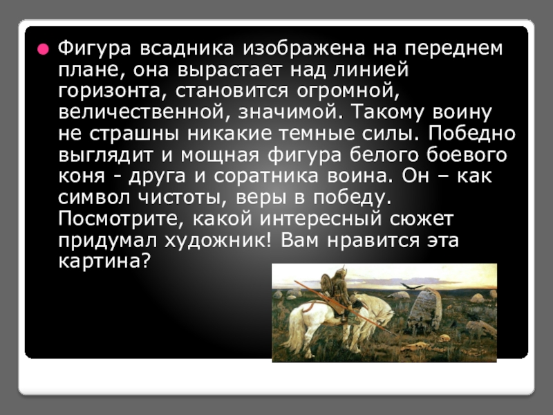 становится огромной, величественной, значимой. Такому воину не страшны никакие темные силы. Победно выглядит и мощная фигура белого боевого коня - друга и соратника воина. Он – как символ чистоты, веры в победу. Посмотрите, какой интересный сюжет придумал художник! Вам нравится эта картина?