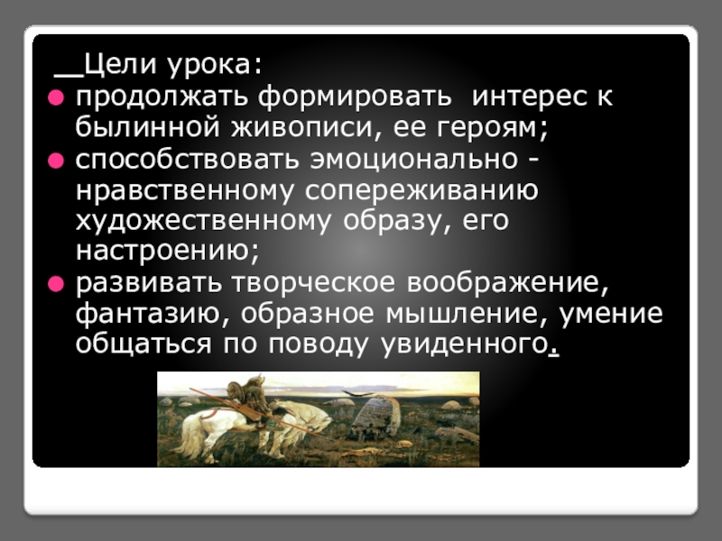 Слайд 1Урок русского языка по теме: "Былинная живопись. Рассматривание картины В.М. Васнецова